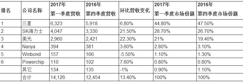 根據Trendforce公司旗下DRAMeXchange事業部公布的最新統計數據顯示,在2017年首季中,內存組件的整體銷售額達到刷新紀錄的141億美元,較上年同期增長達13.4%。