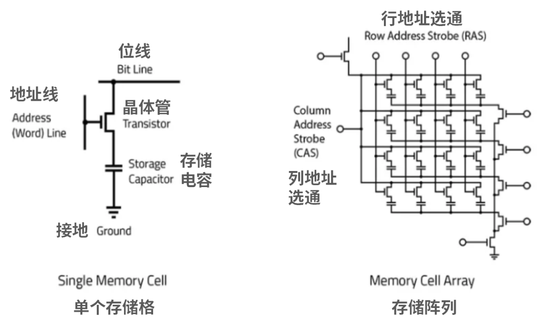 DRAM由許多重復的位元格組成,每一個基本單元由一個電容和一個晶體管構(gòu)成。電容中存儲電荷量的多寡,用于表示“0”和“1”。而晶體管,則用來控制電容的充放電。