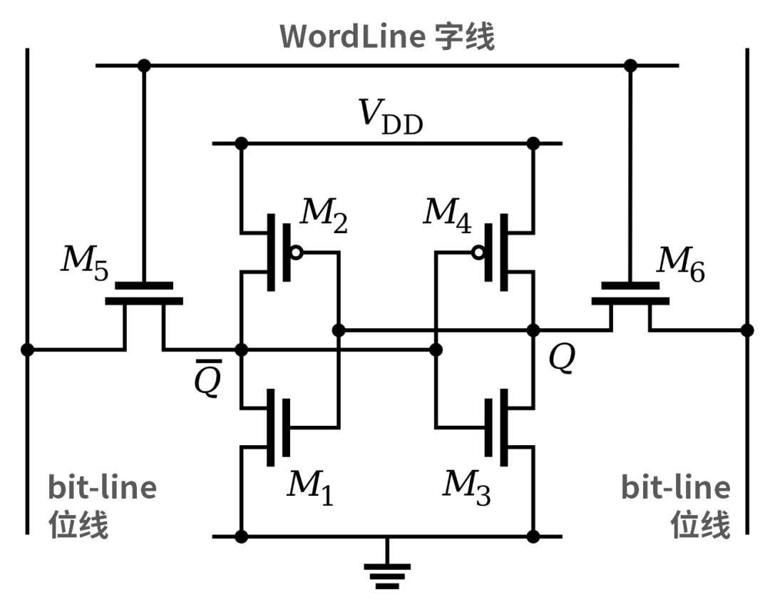 SRAM的基本單元,則最少由6管晶體管組成:4個場效應(yīng)管(M1,M2,M3,M4)構(gòu)成兩個交叉耦合的反相器,2個場效應(yīng)管(M5,M6)用于讀寫的位線(BitLine)的控制開關(guān),通過這些場效應(yīng)管構(gòu)成一個鎖存器(觸發(fā)器),并在通電時鎖住二進制數(shù)0和1。因此,SRAM被稱為“靜態(tài)隨機存儲器”。