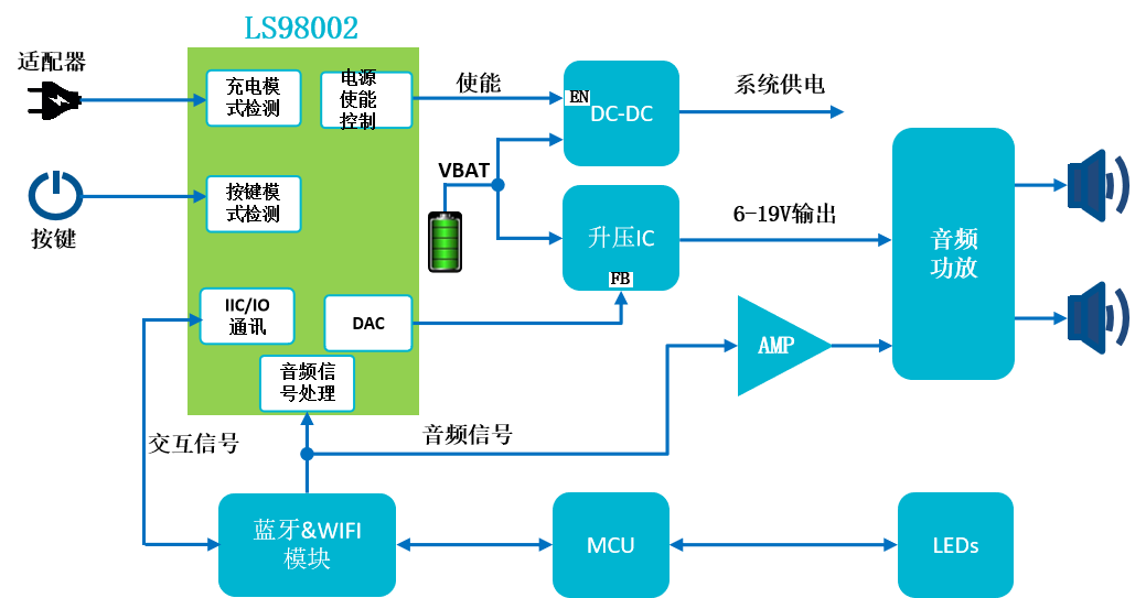 現(xiàn)場(chǎng)可重構(gòu)IC、通用可配置的模數(shù)混合芯片內(nèi)部集成豐富的模擬資源和數(shù)字資源,可輕松替代電路中的各種標(biāo)準(zhǔn)器件,并按照客戶要求組合成最優(yōu)小型ASIC,縮短開發(fā)周期,降低成本。下面介紹LS98002現(xiàn)場(chǎng)可重構(gòu)CPLD芯片應(yīng)用案例—藍(lán)牙音箱。