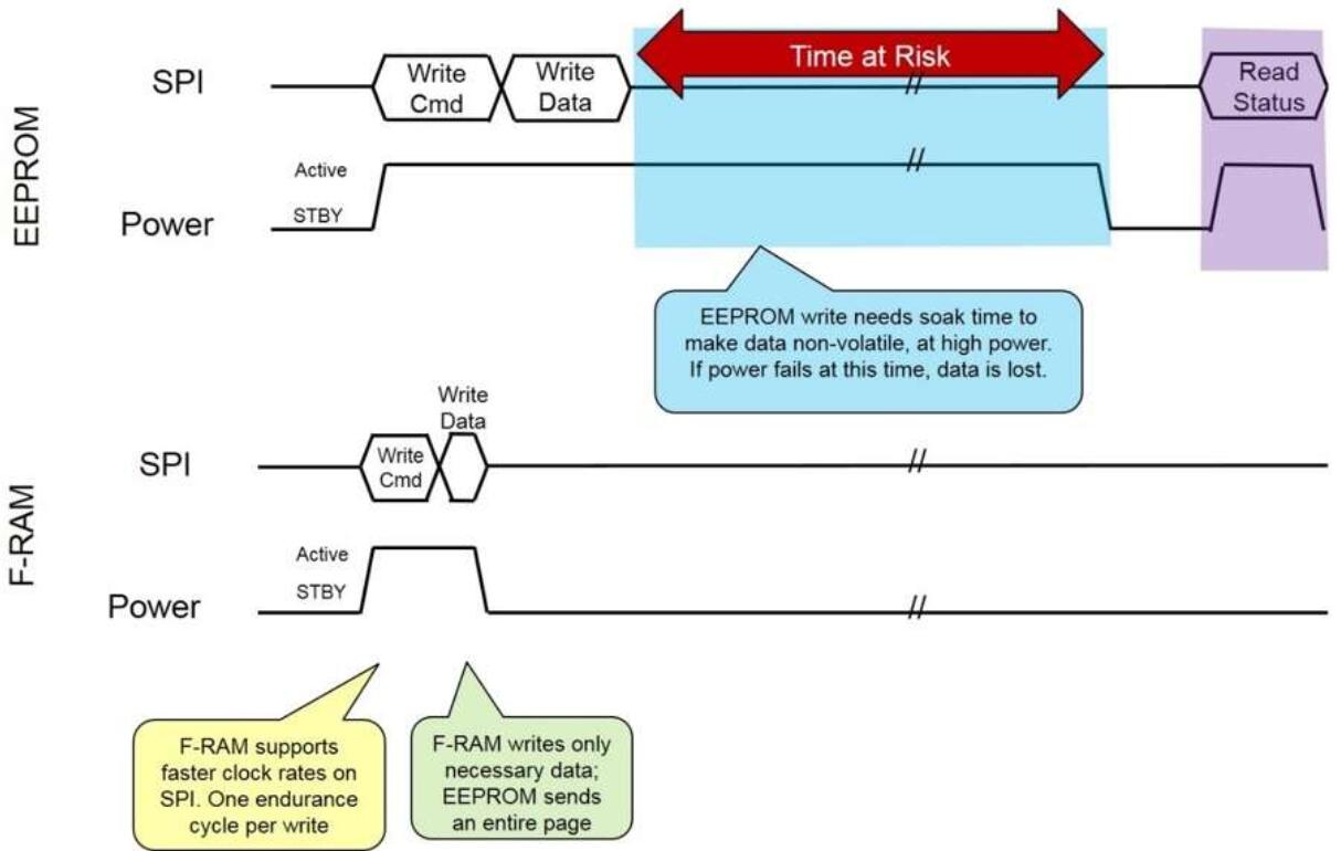 圖2:FRAM的快速寫入速度可保護使用EEPROM設備時可能丟失的關鍵數據。(來源:賽普拉斯半導體)