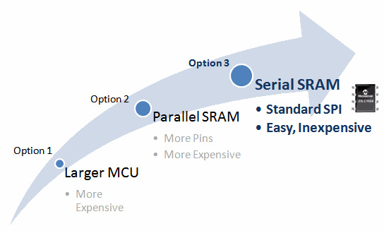 3. 串行SRAM現(xiàn)在支持向設計中靈活添加RAM,而不會帶來大型單片機或并行RAM的缺點,它使用簡單的4引腳SPI接口。 SDI和SQI接口可將數(shù)據速率提高4倍,這些器件還會通過這兩個接口來提升性能。
